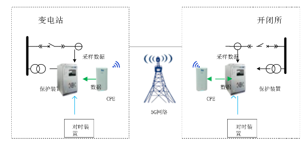 光纖差動保護采用專用光纖或復用2M光纖通道,路由相同且收發延時一致,采用乒乓法原理進行數據同步,不依賴外部時鐘同步。而5G差動保護采用5G網絡,通道延遲抖動較大,傳輸延時不固定,上下行通道延時不一致,需要采用類似變電站內組網SV采用的基于對時同步下的數據傳輸和采樣插值同步方案。當前階段,5G無線終端CPE不支持對時輸出,只能采用外部時鐘同步,通過外部授時系統(北斗和GPS授時)實現數據同步,配置如圖5-1所示。
