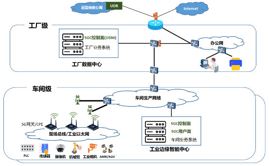 在工廠數(shù)據(jù)中心部署5G核心網(wǎng)控制面網(wǎng)元UDM,企業(yè)層及管理層業(yè)務(wù)軟件(例如,ERP及MES等),通過邊界交換機和車間生產(chǎn)網(wǎng)絡(luò)及企業(yè)辦公網(wǎng)實現(xiàn)互通。辦公網(wǎng)通過網(wǎng)關(guān)路由器接入互聯(lián)網(wǎng)。在網(wǎng)關(guān)路由器及各個邊界交換機上配置防火墻,防止非法訪問和惡意攻擊。