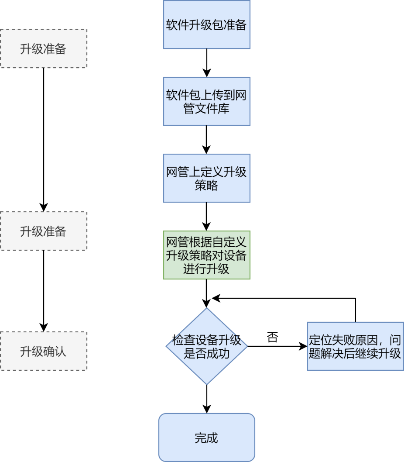 根據(jù)現(xiàn)場業(yè)務(wù)驗證需要,對設(shè)備軟件定期進行版本更新。在現(xiàn)場實施前,在實驗室環(huán)境先進行預(yù)測試及軟件版本修正完善,待穩(wěn)定性驗證通過后,再由運維小組進行設(shè)備更新升級。軟件升級流程如下: