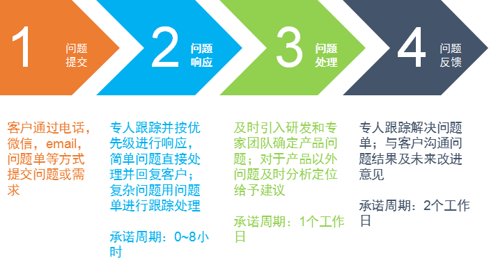 支持多種形式的渠道(電話、微信、郵件和售后技術(shù)服務(wù)工單系統(tǒng))接收故障申報,根據(jù)問題性質(zhì)及等級提供不同程度的響應(yīng)。