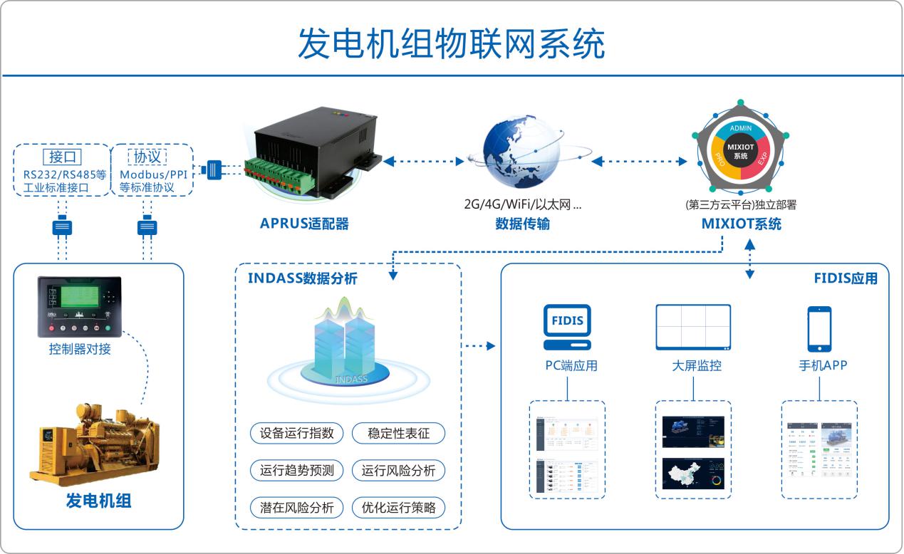 本方案通過適配器實現多源異構數據采集、遠程控制執行、集中智能控制、以及邊緣計算服務。針對發電機(組)設備使用場景及地域,本項目提供不同版本的適配器,包括APRUS II 和 APRUS III(第二代、第三代可編程工業互聯網適配器)、APIECO(可編程工業互聯網邊緣計算控制器)。APRUS II  和 APRUS III 適用于大多數工業設備,通過可編程方法,決定使用不同物理接口、使用不同數據交互協議、與不同平臺交互,可廣泛適配各自不同工業設備。APIECO 除了兼有 APRUS 系列的數據采集功能外,還可以實現邊緣計算,以及復雜裝置的聯動智能控制。數據傳輸支持2G、4G及wifi傳輸,保障客戶數據的實時獲取。