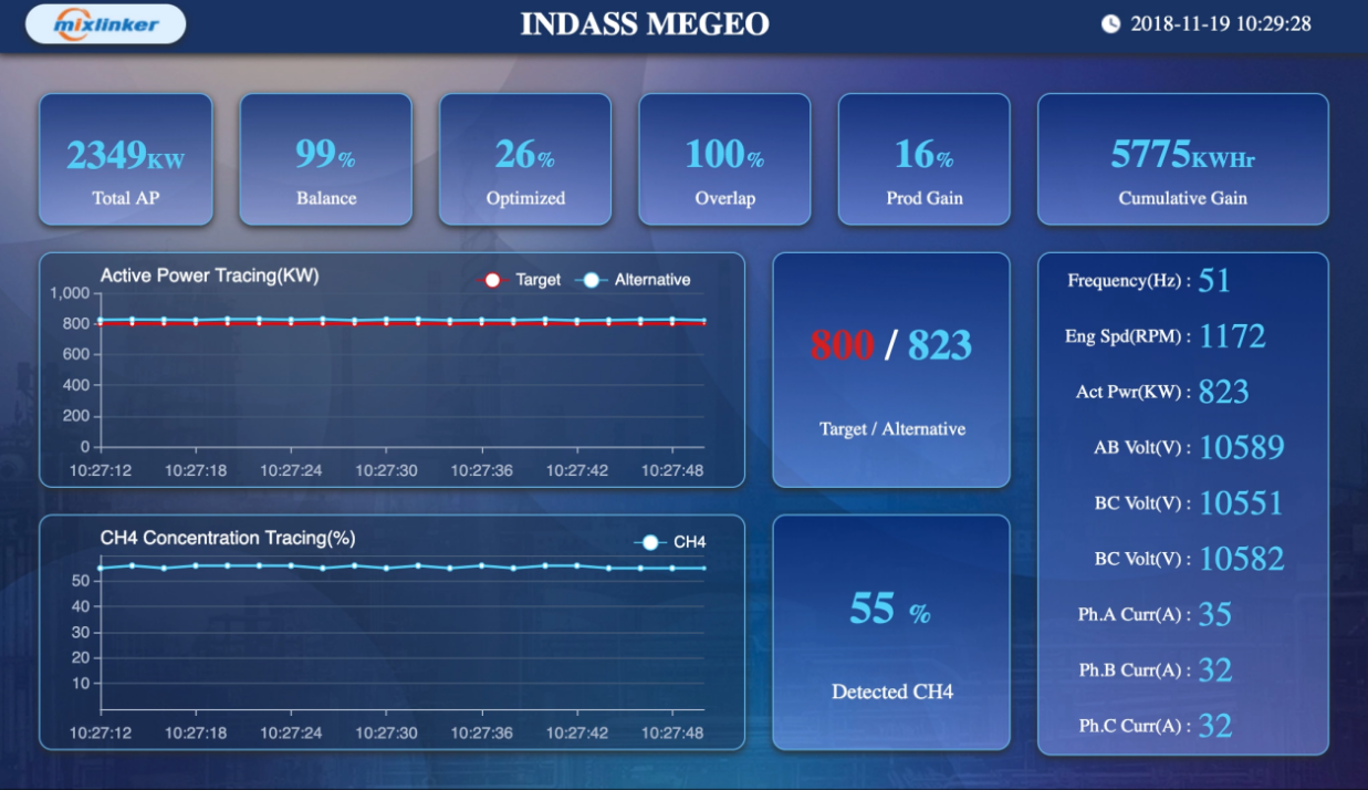 在成功采集濟柴沼氣發電機組設備運行數據后,智物聯MixIOT收集大量數據樣本,對此類數據樣本進行分析、處理、計算,同時與濟柴進行合作,建立符合實際生產場景的數學模型,并應用于中油濟柴的客戶膠州百川電廠的沼氣發電機組,在實際生產場景中,系統可以根據沼氣(甲烷)濃度來實時計算出發電機組有功功率最優值,幫助客戶提升發電能效,提高發電收益。