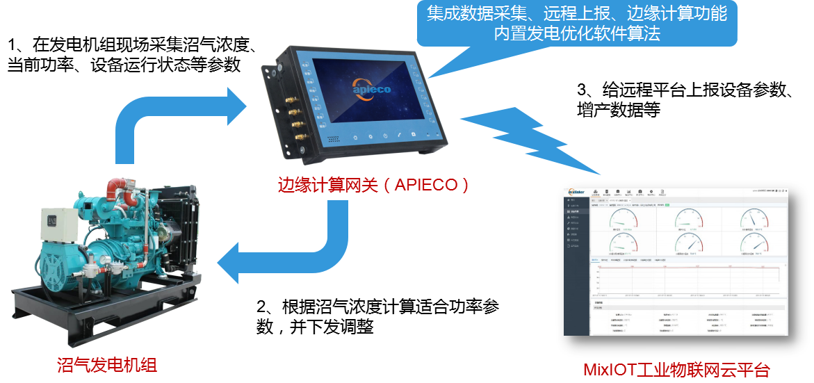 本方案沼氣發電效率優化Megeo((Methane Generator Edge Optimizer))主要由智物聯的邊緣計算控制器(APIECO)和工業互聯網平臺(MixIOT)組成,邊緣計算控制器工作在設備端,一方面采集設備運行相關參數,一方面用內部算法模型自動匹配不同的甲烷濃度對應的最佳功率值,并自動調節功率,讓機組發電效率達到最優。這些設備運行參數,以及通過優化后機組發電量的增量,邊緣計算控制器除了在界面進行展示之外,還將這些數據上報到MixIOT平臺。MixIOT一方面展示設備運行參數以及設備功率優化效果,另一方面對所有設備進行集中管理以及策略優化。