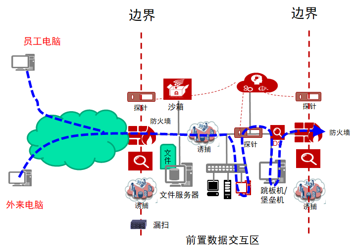 2、所有子網的邊界處部署流量探針,防火墻、IPS、路由器和交換機部署日志探針。