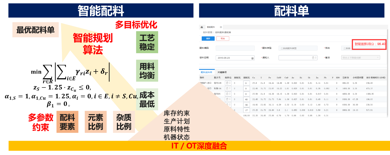 智能配料系統(tǒng)記錄配料相關(guān)的各種約束(約束條件在使用過(guò)程中進(jìn)行迭代優(yōu)化),動(dòng)態(tài)調(diào)用最新原料的存量和元素含量,由智能算法進(jìn)行原料的投入配比規(guī)劃輸出。