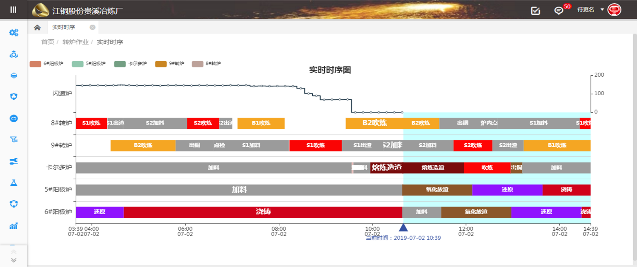 根據(jù)熔煉作業(yè)數(shù)據(jù)自動(dòng)按熔爐組實(shí)時(shí)狀態(tài)形成節(jié)奏時(shí)序圖,提升整個(gè)熔煉系統(tǒng)調(diào)度指揮管理的智能化水平,以信息共享、過(guò)程可控、科學(xué)預(yù)判為重心,構(gòu)建閃速爐、轉(zhuǎn)爐、陽(yáng)極爐的生產(chǎn)管控的智能化支撐,共享三大爐完整的作業(yè)進(jìn)度,及時(shí)、準(zhǔn)確調(diào)整作業(yè)要求,實(shí)現(xiàn)作業(yè)預(yù)期判斷和產(chǎn)品質(zhì)量最優(yōu)控制。