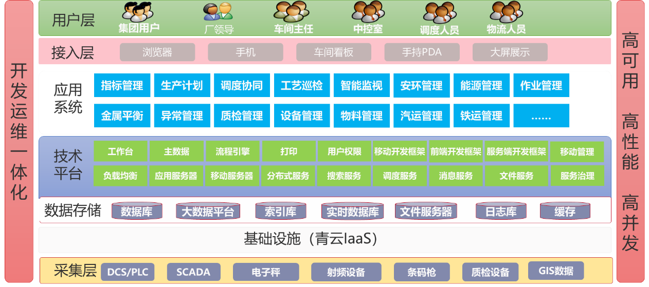 應(yīng)用層:主要包括指標(biāo)管理、生產(chǎn)計(jì)劃、調(diào)度協(xié)同、工藝巡檢、智能監(jiān)視、安環(huán)管理、能源管理、作業(yè)管理、金屬平衡、異常管理、質(zhì)檢管理、設(shè)備管理、物料管理、汽運(yùn)管理、鐵運(yùn)管理等。