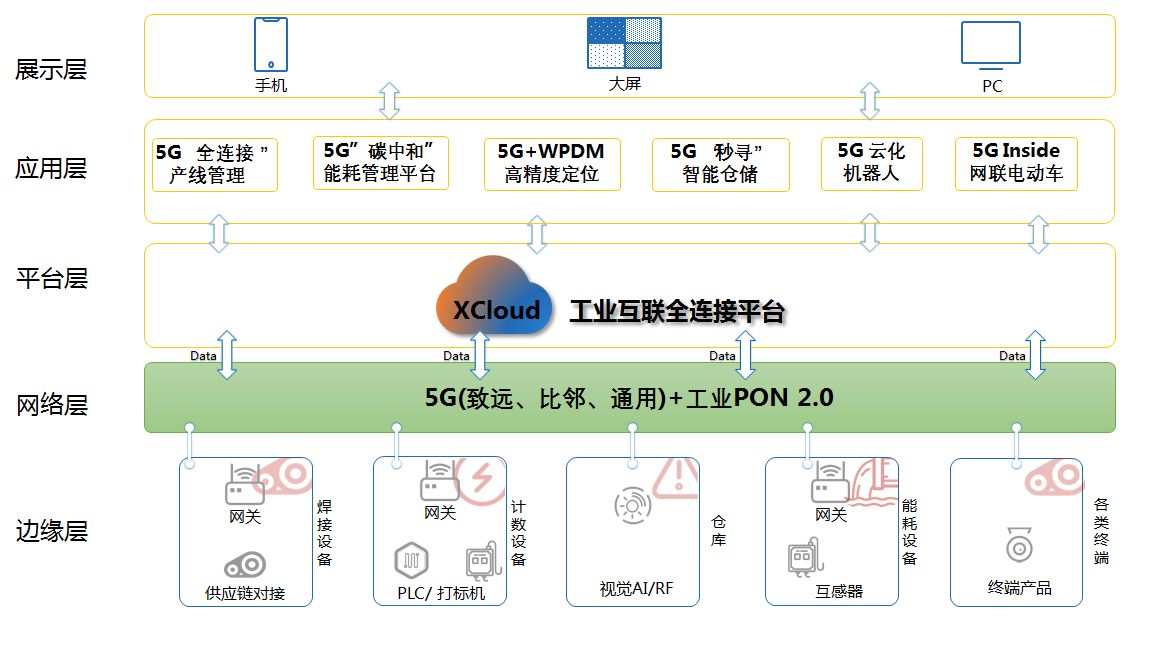 通訊層用于邊緣層硬件設施的數據傳輸及上云,包括有線以太網、無線WIFI、無線4G/5G等多種常用通訊方式,以通訊可靠、傳輸穩定、經濟環保為原則,根據現場實際傳輸條件為硬件設施選擇最合適的通訊方式,本方案采用電信5G網絡和工業PON(光網絡)相結合的方式。