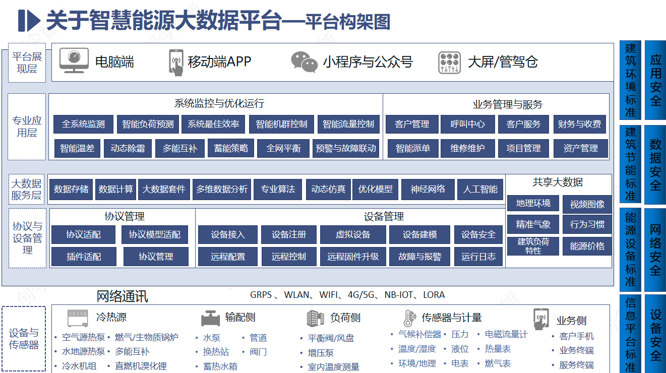 技術(shù)路線:智慧能源大數(shù)據(jù)平臺(tái)基于全面的系統(tǒng)運(yùn)行數(shù)據(jù)監(jiān)測(cè)和分析,結(jié)合熱能、建筑環(huán)境行業(yè)眾多專業(yè)算法和最佳效率模型,