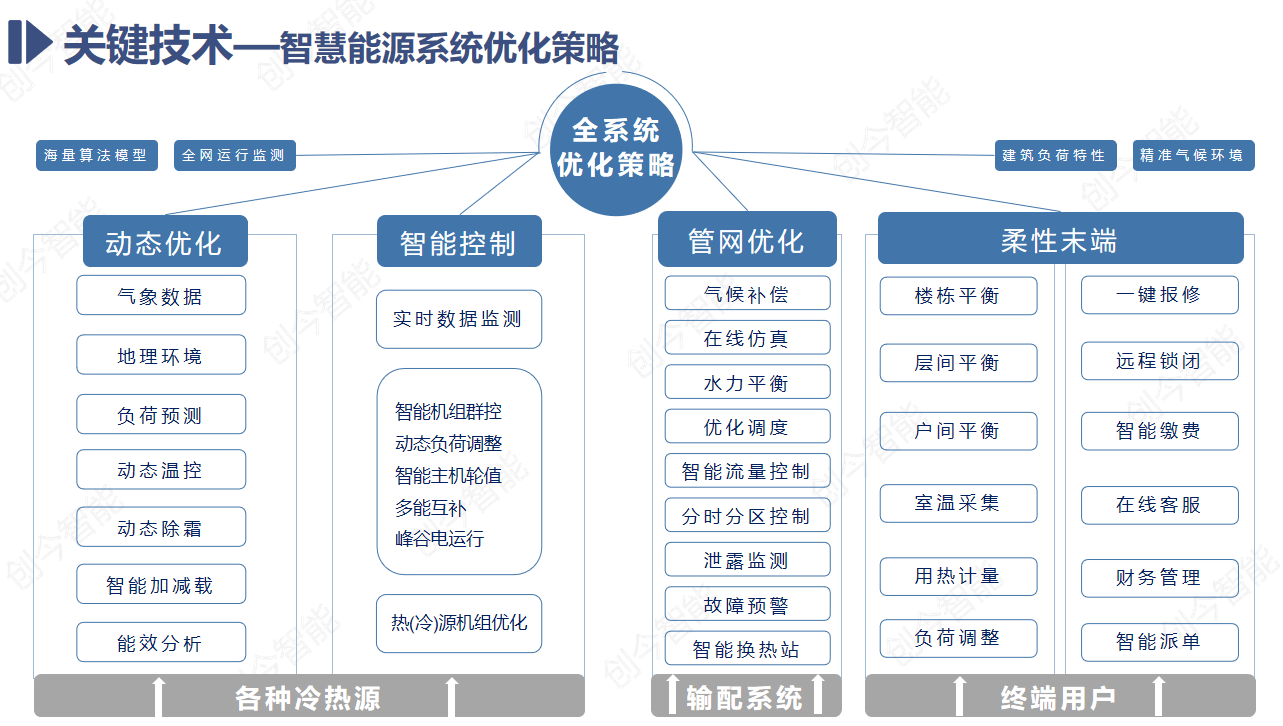 創(chuàng)今基于互聯(lián)網(wǎng)、大數(shù)據(jù)與人工智能技術(shù),融合清潔能源,建筑環(huán)境,工農(nóng)業(yè)生產(chǎn)等各領(lǐng)域?qū)I(yè)技術(shù)與算法,面向政府部門、能源設(shè)備與系統(tǒng)供給企業(yè)、能源系統(tǒng)用戶、科研機(jī)構(gòu)、工程設(shè)計(jì)、維護(hù)服務(wù)等相關(guān)機(jī)構(gòu)提供綜合能源數(shù)字化、智慧化服務(wù)。智慧能源大數(shù)據(jù)平臺(tái)基于全面的系統(tǒng)運(yùn)行數(shù)據(jù)監(jiān)測(cè)和分析,結(jié)合熱能、建筑環(huán)境行業(yè)眾多專業(yè)算法和最佳效率模型,根據(jù)精準(zhǔn)氣象、建筑負(fù)荷、用能習(xí)慣的變化精準(zhǔn)預(yù)測(cè)每個(gè)能源站的動(dòng)態(tài)負(fù)荷、并實(shí)時(shí)計(jì)算不同負(fù)荷條件下每個(gè)系統(tǒng)運(yùn)行的最佳效率區(qū)間,智能調(diào)整與控制機(jī)組出力、啟停數(shù)量、溫度、流量、閥門開閉等系統(tǒng)運(yùn)行狀態(tài),保持能源站長(zhǎng)期最高效運(yùn)行,實(shí)現(xiàn)能源站“按需供熱”,高效節(jié)能。