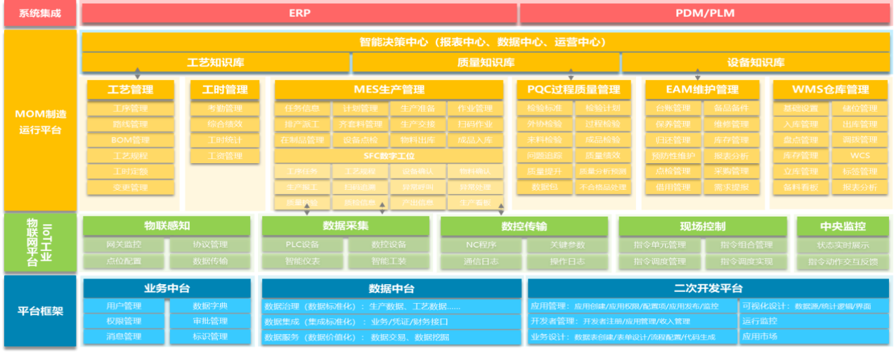首航機械火箭總裝數字化工廠建設按照平臺化的架構進行系統功能架構,平臺框架以業務中臺、數據中臺和二次開發平臺為基礎,搭建IIoT工業物聯網平臺、MOM制造運行管理平臺、工藝管理平臺等包含100多個功能應用與服務,滿足不同業務場景需求,幫助首航機械總裝事業部實現橫向與縱向全方位數據集成。