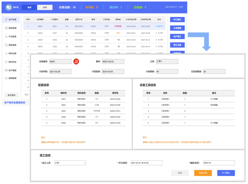 集成工藝管理平臺和制造運營管理系統信息,通過在各生產單元一體機終端建立數字工位(HMI),作為生產管控平臺在現場的執行抓手,包含生產準備、生產報工、質量檢驗、異常處理等現場執行操作業務模塊。