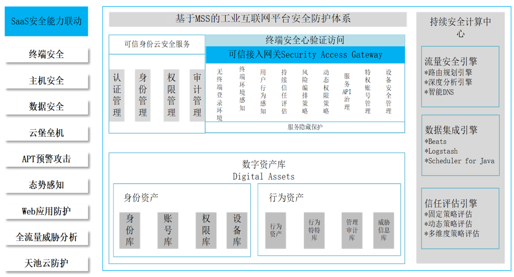 針對上述業(yè)務場景下的安全痛點問題,杭州安恒信息規(guī)劃設計并實施了一套基于MSS的工業(yè)互聯(lián)網平臺安全防護解決方案。該方案圍繞工業(yè)互聯(lián)網平臺安全、應用安全、數(shù)據(jù)安全、網絡安全、控制安全、設備安全,運用SaaS化、服務化的資源整合方式,形成按需分配、彈性擴展、高效可靠的安全能力資源池,并藉此構筑新型持續(xù)一體化安全防護體系,解決了工業(yè)互聯(lián)網平臺的云上業(yè)務系統(tǒng)安全問題。