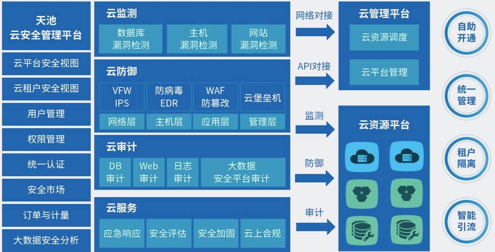 通過集中化的管理平臺,實現(xiàn)云平臺資源的集中化管理;通過建設集中的安全中心,實現(xiàn)安全能力的統(tǒng)一配置、運維,安全事件集中分析,展示全局安全態(tài)勢,可實時對請求進行持續(xù)動態(tài)評估,構建整體安全防護能力。