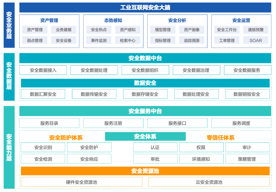 圍繞工業(yè)互聯(lián)網邊緣層、工業(yè)IaaS層、工業(yè)PaaS層、工業(yè)SaaS層以及工業(yè)數(shù)據(jù)面臨的安全風險,建設覆蓋工業(yè)APP安全、工業(yè)云平臺安全、終端安全、數(shù)據(jù)安全需求的一站式安全能力資源池。