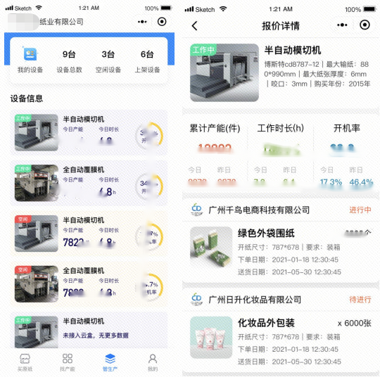 第一,訂單拆分。以具體訂單為例,為提高生產(chǎn)效率,縮短生產(chǎn)鏈條,對(duì)訂單按照最小顆粒度進(jìn)行拆解。比方說美思天地蓋的包裝,共需要6個(gè)工藝,我們會(huì)將其拆成印刷、啞膜、開槽、裱、內(nèi)托、粘合等6個(gè)工藝,然后通過不同的協(xié)同工廠,一般是2-3家。之后再將生產(chǎn)設(shè)備連接至線上平臺(tái),進(jìn)行統(tǒng)一調(diào)度,組成新的生產(chǎn)線,按照先前確定好的價(jià)格開展生產(chǎn),從而提高企業(yè)對(duì)于閑置產(chǎn)能利用的同時(shí),降低生產(chǎn)成本,在價(jià)格上形成競(jìng)爭(zhēng)優(yōu)勢(shì)。