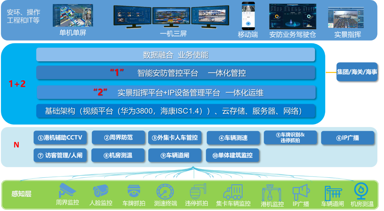 用:該層次涵蓋了三個終端和多個業務部門。三個終端包括數字大屏、專業坐席和單屏,用于實時展示和監控港口的安防情況。同時,三個生產業務部門(安環、操作、工程技術)通過系統進行安全管理和監測。此外,移動端通過公眾號提供標清和高清視頻直播,以及訪客預約功能。上級部門(如集團)和口岸監管單位(如海關、海事)通過GB/T 28181和ONVIF等協議實現與智慧安防管控系統的視頻信息共享。
