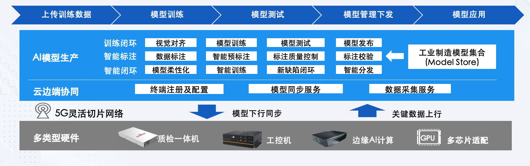 百度智能云提供全套的視覺(jué)解決方案,針對(duì)工業(yè)視覺(jué)需求推出百度工業(yè)視覺(jué)智能平臺(tái),提供圖形化AI訓(xùn)練平臺(tái),可以“0”代碼基礎(chǔ)的操作進(jìn)行模型自訓(xùn)練和優(yōu)化,包括視覺(jué)對(duì)齊、數(shù)據(jù)標(biāo)注、模型訓(xùn)練、模型評(píng)測(cè)、模型下發(fā)等功能。預(yù)測(cè)、模型訓(xùn)練采用端云一體模式,構(gòu)建了利用缺陷數(shù)據(jù)實(shí)現(xiàn)模型預(yù)測(cè)準(zhǔn)確率的不斷優(yōu)化升級(jí)的閉環(huán)。模型云端訓(xùn)練、模型快速下發(fā)至邊緣節(jié)點(diǎn)、模型通過(guò)邊緣計(jì)算進(jìn)行缺陷預(yù)測(cè),邊緣節(jié)點(diǎn)采集的數(shù)據(jù)上傳到云端反哺模型訓(xùn)練迭代。