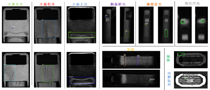 自動(dòng)化部分,設(shè)計(jì)部署了18個(gè)相機(jī)和光源,對(duì)零件外表面和內(nèi)腔實(shí)現(xiàn)流水線(xiàn)級(jí)別的圖像拍攝,在不同光源下對(duì)物體六個(gè)外表面及內(nèi)腔拍攝18張圖像,實(shí)現(xiàn)了360度圖像采集。