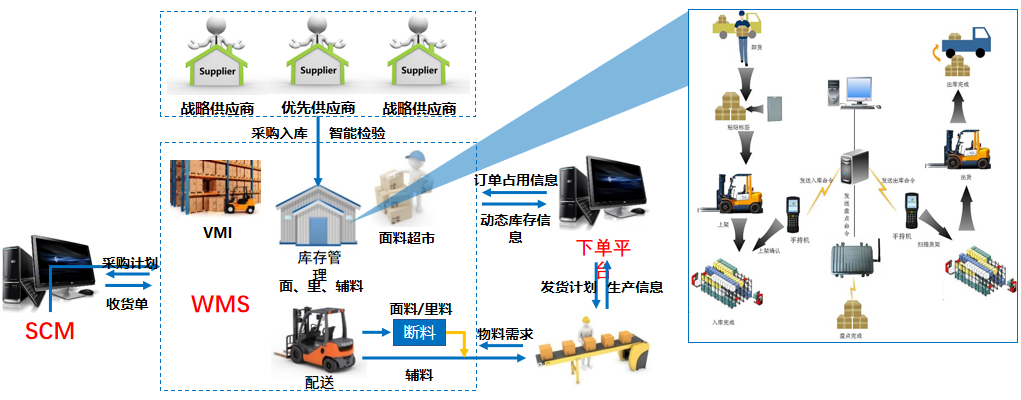 海思堡項(xiàng)目通過產(chǎn)品數(shù)字化及數(shù)據(jù)實(shí)時化,通過OMS定制下單系統(tǒng),輔助AI量體,實(shí)現(xiàn)用戶個性化定制下單,由TDC技術(shù)數(shù)據(jù)中心實(shí)現(xiàn)工藝、版型等的自動處理,并通過CAD實(shí)現(xiàn)版型生成。SCM與WMS系統(tǒng),實(shí)現(xiàn)供應(yīng)商高效協(xié)同與物料精準(zhǔn)管理,由APS高效排產(chǎn),MES信息化驅(qū)動裁剪、縫制、后整、包裝全生產(chǎn)過程,成品WMS及TMS對接,實(shí)現(xiàn)成品的高效管理及實(shí)時追蹤?;谏鲜龅娜鞒绦畔⒒桨?,同時,對接鋪布、視覺檢測、裁剪、吊掛、AGV、分揀、亮燈、手持機(jī)等自動化設(shè)備和應(yīng)用,實(shí)現(xiàn)大規(guī)模個性化定制的服裝智能制造解決方案。
