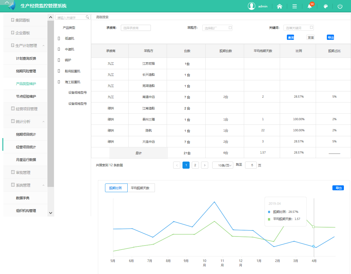 脫期項目統(tǒng)計主要基于產(chǎn)品類型、配套企業(yè)、采購方以及關鍵詞等,對脫期項目進行篩選統(tǒng)計,呈現(xiàn)脫期臺數(shù)、脫期天數(shù)、脫期比例、脫期占比等統(tǒng)計表格,并形成趨勢圖。拖期項目統(tǒng)計功能示意如下圖所示: