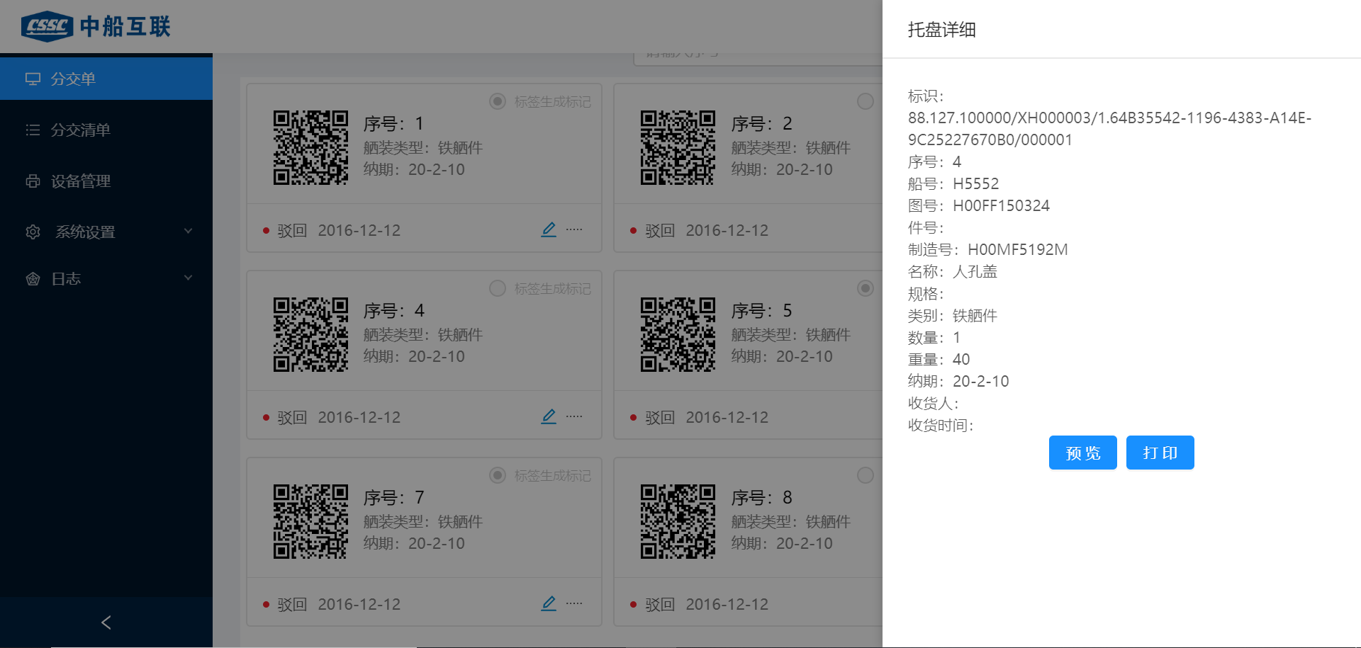 非標件成品賦碼模塊結合工業(yè)互聯(lián)網(wǎng)標識解析二級節(jié)點,獲取在制非標件編碼、屬性、圖紙等信息,并且通過與打印機、掃描設備等賦碼和標識識別設備集成,實現(xiàn)標識的快速打印,同時通過打印信息與生產(chǎn)制造信息的集成,實現(xiàn)配套企業(yè)生產(chǎn)制造狀態(tài)的實時在線反饋。其系統(tǒng)界面如下圖所示:
