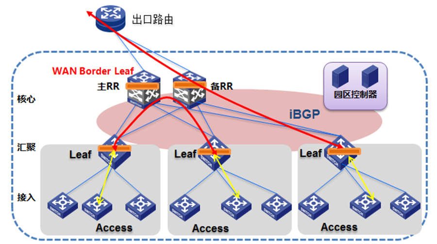 整個工廠網(wǎng)絡(luò)由核心、匯聚、接入三層設(shè)備組成,再搭配園區(qū)SDN控制器。其中接入層設(shè)備部署在生產(chǎn)線附近,而匯聚、核心設(shè)備之間則構(gòu)建overlay網(wǎng)絡(luò),同時采用分布式L3網(wǎng)關(guān)并通過可靠機制來抑制廣播風(fēng)暴。接入層設(shè)備采用不同的VLAN進行接入位置的標(biāo)識,通過TRUNK的方式上行到匯聚層,匯聚層完成VLAN到VxLAN的映射。