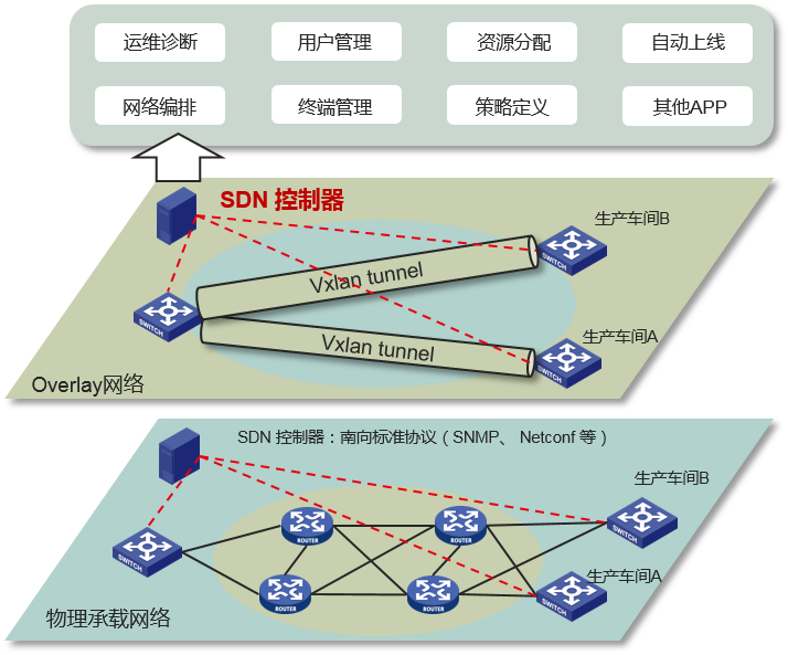 ? 核心匯聚層:本次方案采用SDN VxLAN技術(shù)設(shè)計工廠內(nèi)核心匯聚層網(wǎng)絡(luò),網(wǎng)絡(luò)可以抽象為物理承載網(wǎng)絡(luò)和面向應(yīng)用的Overlay網(wǎng)絡(luò)。這種網(wǎng)絡(luò)設(shè)計方式的兩大特征是柔性網(wǎng)絡(luò)和軟件定義。柔性一方面指網(wǎng)絡(luò)架構(gòu)靈活,業(yè)務(wù)部署(應(yīng)用/終端)與位置無關(guān);另一方面指以人和業(yè)務(wù)應(yīng)用為核心,所有網(wǎng)絡(luò)資源根據(jù)人和業(yè)務(wù)需要移動。軟件定義指基于SDN思想將網(wǎng)絡(luò)控制平面集中,實現(xiàn)網(wǎng)絡(luò)設(shè)備的自動部署、業(yè)務(wù)按需交付,將運維人員從重復(fù)勞動中解放出來。