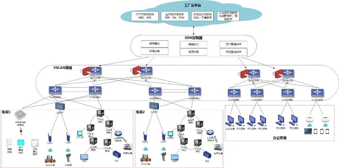 本方案旨在為制造業(yè)企業(yè)提供一套可靠的智能工廠網(wǎng)絡(luò)建設(shè)方案。方案利用工業(yè)物聯(lián)網(wǎng)、SDN、IPv6等新興技術(shù),實現(xiàn)工業(yè)場景下人員、設(shè)備、物料、產(chǎn)品的海量互聯(lián),為工廠實現(xiàn)智能生產(chǎn)、協(xié)同制造和柔性制造提供網(wǎng)絡(luò)支撐。