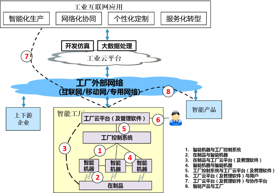 本方案在工業(yè)互聯(lián)網(wǎng)網(wǎng)絡(luò)體系架構(gòu)中,覆蓋智能機器與工廠控制系統(tǒng),工廠控制系統(tǒng)與工廠云平臺(及管理軟件)。詳見工業(yè)互聯(lián)網(wǎng)體系架構(gòu)圖中的1,5兩部分。