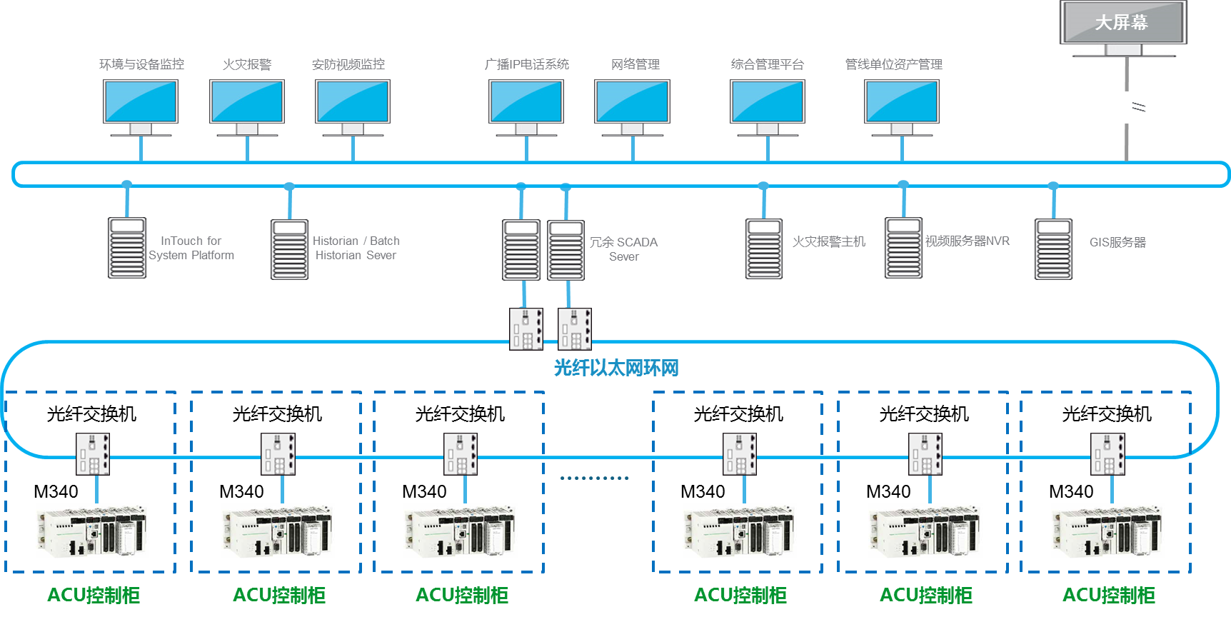 首鋼園區(qū)綜合管廊一期工程涵蓋首鋼園區(qū)秀池南街和秀池西路。首鋼園區(qū)綜合管廊收納了電力、電信、給水、熱力等市政管線,管廊總長約750米,兩艙設(shè)計(綜合艙、電力艙),設(shè)1個監(jiān)控中心(含弱電機房)、14個防火分區(qū)。綜合管廊采用M340 PLC作為環(huán)境與設(shè)備監(jiān)控系統(tǒng)的現(xiàn)地區(qū)域控制器。在管廊沿線弱電設(shè)備間內(nèi)設(shè)置一臺ACU(內(nèi)含一臺千兆以太網(wǎng)交換機,一套數(shù)據(jù)采集控制單元,一套UPS);每個防火區(qū)間設(shè)置一套現(xiàn)場控制箱ACU(內(nèi)含一臺千兆以太網(wǎng)交換機、一套數(shù)據(jù)采集控制單元、一套UPS)。