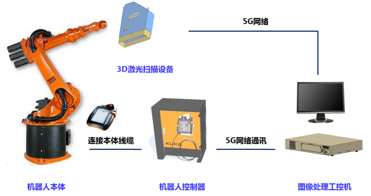 整個(gè)涂膠過程需要在一個(gè)節(jié)拍內(nèi)完成,因此需要在4分鐘內(nèi)完成3D掃描成型,激光引導(dǎo)定位、涂膠高速跟隨拍照、圖片處理、檢測驗(yàn)證和結(jié)果判定作業(yè)。其中的技術(shù)難點(diǎn)是實(shí)時(shí)掃描數(shù)據(jù)、大量高清圖片的實(shí)時(shí)傳遞,需要借助5G網(wǎng)絡(luò)實(shí)現(xiàn)。