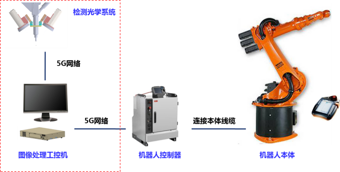 在涂膠機(jī)器人手臂加裝3D激光掃描設(shè)備,智能相機(jī)和補(bǔ)光設(shè)備,因機(jī)器手臂需進(jìn)行靈活作業(yè),所以數(shù)據(jù)通訊不能采用傳統(tǒng)的網(wǎng)線接入的方式,同時(shí)因3D掃描數(shù)據(jù)是動態(tài)數(shù)據(jù)傳輸,需實(shí)時(shí)傳輸且數(shù)據(jù)量較大,需借助5G網(wǎng)絡(luò)實(shí)現(xiàn)大數(shù)據(jù)同步傳輸,便于圖像處理系統(tǒng)能依據(jù)數(shù)據(jù)實(shí)時(shí)成像,其架設(shè)示例如下:紅框標(biāo)注部分為3D激光掃描設(shè)備和智能相機(jī)。