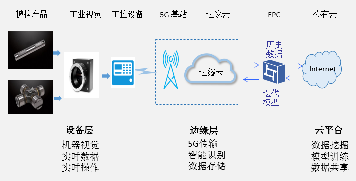基于5G和人工智能技術(shù)的產(chǎn)品質(zhì)量實時檢測和優(yōu)化方案通過機器視覺、5G蜂窩無線、人工智能、邊緣計算等技術(shù)結(jié)合,實現(xiàn)了產(chǎn)品質(zhì)量的實時高精度檢測,通過工業(yè)云平臺實現(xiàn)檢測模型的迭代提高和共享。