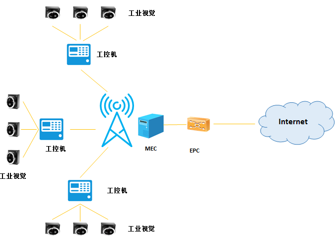 本方案為兩級星型拓撲結(jié)構(gòu)(如下圖所示),第一級為工業(yè)視覺設(shè)備和工控機之間的星型組網(wǎng),第二級為工控機和蜂窩基站間的星型組網(wǎng)。首先,多個工業(yè)視覺設(shè)備和一個工控機通過工業(yè)總線形成星型組網(wǎng),完成工業(yè)產(chǎn)品圖像數(shù)據(jù)的傳輸和工業(yè)殘次品的剔除控制;其次,工控機和蜂窩基站形成星型組網(wǎng),完成基于模型的圖像實時決策判斷和數(shù)據(jù)的傳輸。