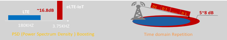 eLTE-IoT引入重復+合并解調技術,降低了信號解調的信噪比要求,理論上有用信號可以比噪聲低10dB以上,即干擾信號可以比有用信號的功率大10倍,可以解決由于干擾導致的底噪抬升問題。