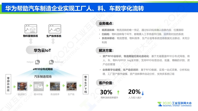 “全要素連接,多域數據協同,是制造數字化轉型的基礎。華為云IoT工業互聯網解決方案提供生產要素的全連接,一站式的工業數據的治理和孿生分析,幫助制造業企業實現了生產現場制造KPF的優化,質量的全流程追溯和管控。我們提供創新的5G的RFID服務,實現了倉儲的數字化、物料全程自動化跟蹤、商場計劃、物流管理、供應管理需求動態協同,提升物料的流轉效率30%。當前,制造業數字化轉型正當時,華為愿與產業鏈上下游伙伴們攜手供應,共同構建工業互聯網的黑土地。”