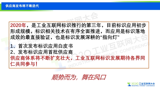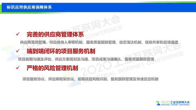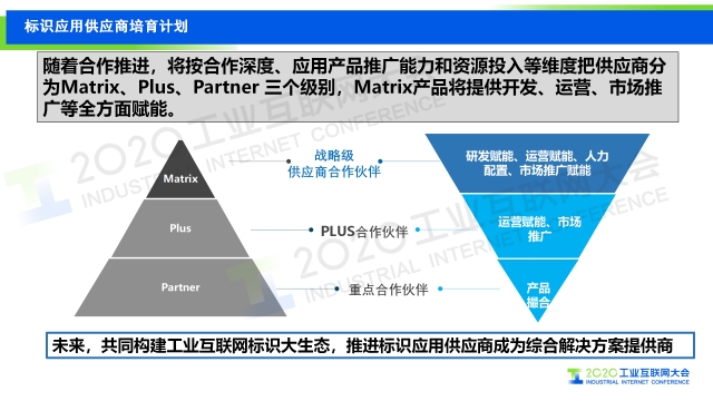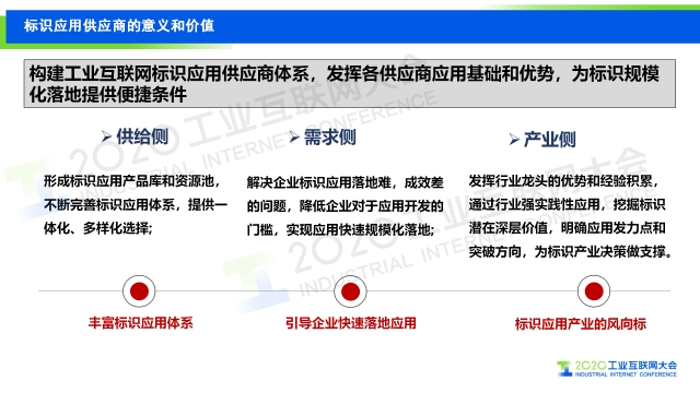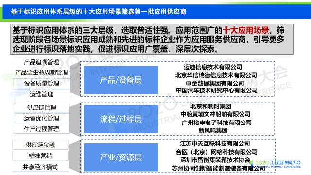 在2020工業(yè)互聯(lián)網(wǎng)大會(huì)“工業(yè)互聯(lián)網(wǎng)標(biāo)識(shí)”主題論壇上,中國(guó)信息通信研究院工業(yè)互聯(lián)網(wǎng)和物聯(lián)網(wǎng)研究所副總工程師羅松分享了我國(guó)工業(yè)互聯(lián)網(wǎng)標(biāo)識(shí)解析體系建設(shè)情況及中國(guó)信息通信研究院在建立標(biāo)識(shí)應(yīng)用供應(yīng)商體系方面所做的工作,會(huì)上還發(fā)布了基于標(biāo)識(shí)應(yīng)用體系三大層級(jí)十個(gè)應(yīng)用場(chǎng)景的首批工業(yè)互聯(lián)網(wǎng)標(biāo)識(shí)應(yīng)用供應(yīng)商合作伙伴名單。