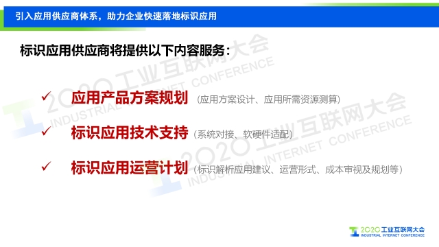 我國(guó)工業(yè)互聯(lián)網(wǎng)標(biāo)識(shí)解析體系正逐步完善,標(biāo)識(shí)應(yīng)用初具規(guī)模。當(dāng)前,中國(guó)信息通信研究院按照標(biāo)識(shí)應(yīng)用對(duì)象的不同層級(jí)構(gòu)建工業(yè)互聯(lián)網(wǎng)標(biāo)識(shí)應(yīng)用體系,分析應(yīng)用價(jià)值,能夠引導(dǎo)標(biāo)識(shí)應(yīng)用向更廣范圍、更大規(guī)模、更深層次發(fā)展。 中國(guó)信息通信研究院正在建立標(biāo)識(shí)應(yīng)用供應(yīng)商體系,發(fā)揮各供應(yīng)商應(yīng)用基礎(chǔ)和優(yōu)勢(shì),為標(biāo)識(shí)規(guī)?;涞靥峁┍憬輻l件,將從三個(gè)方面助力企業(yè)快速落地標(biāo)識(shí)應(yīng)用。一是豐富標(biāo)識(shí)應(yīng)用體系,形成標(biāo)識(shí)應(yīng)用產(chǎn)品庫(kù)和資源池,不斷完善標(biāo)識(shí)應(yīng)用體系,提供一體化、多樣化選擇; 二是引導(dǎo)企業(yè)快速落地應(yīng)用,解決企業(yè)標(biāo)識(shí)應(yīng)用落地難,成效差的問(wèn)題,降低企業(yè)對(duì)于應(yīng)用開(kāi)發(fā)的門(mén)檻,實(shí)現(xiàn)應(yīng)用快速規(guī)模化落地; 三是形成標(biāo)識(shí)應(yīng)用產(chǎn)業(yè)風(fēng)向標(biāo),發(fā)揮行業(yè)龍頭的優(yōu)勢(shì)和經(jīng)驗(yàn)積累,通過(guò)行業(yè)強(qiáng)實(shí)踐性應(yīng)用,挖掘標(biāo)識(shí)潛在深層價(jià)值,明確應(yīng)用發(fā)力點(diǎn)和突破方向,為標(biāo)識(shí)產(chǎn)業(yè)決策做支撐。 詳情見(jiàn)以下演講PPT 敬請(qǐng)閱讀 本次發(fā)布的工業(yè)互聯(lián)網(wǎng)標(biāo)識(shí)應(yīng)用供應(yīng)商將提供應(yīng)用產(chǎn)品方案規(guī)劃、應(yīng)用方案設(shè)計(jì)、應(yīng)用所需資源測(cè)算,標(biāo)識(shí)應(yīng)用技術(shù)支持、系統(tǒng)對(duì)接、軟硬件適配,標(biāo)識(shí)應(yīng)用運(yùn)營(yíng)計(jì)劃,標(biāo)識(shí)解析應(yīng)用建議、運(yùn)營(yíng)形式、成本審視及規(guī)劃等服務(wù)。 未來(lái),中國(guó)信通院工業(yè)互聯(lián)網(wǎng)所將與合作伙伴共同構(gòu)建工業(yè)互聯(lián)網(wǎng)標(biāo)識(shí)生態(tài),支持標(biāo)識(shí)應(yīng)用供應(yīng)商成為綜合解決方案提供商,不斷壯大、完善標(biāo)識(shí)供應(yīng)商體系。