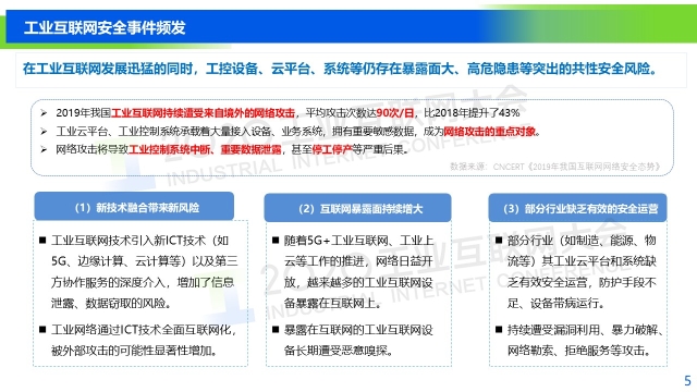 “工業(yè)互聯(lián)網(wǎng)安全事件頻發(fā),主要是因?yàn)楣I(yè)互聯(lián)網(wǎng)在發(fā)展迅猛的同時(shí),工控設(shè)備、云平臺(tái)、系統(tǒng)仍然存在著暴露面大、高危隱患突出的共性安全風(fēng)險(xiǎn)。據(jù)統(tǒng)計(jì),我國(guó)工業(yè)互聯(lián)網(wǎng)持續(xù)遭受來(lái)自境外的網(wǎng)絡(luò)攻擊,這些攻擊會(huì)導(dǎo)致工業(yè)控制系統(tǒng)中斷、重要的數(shù)據(jù)泄露,甚至停工停產(chǎn)等嚴(yán)重后果。經(jīng)分析,這些安全風(fēng)險(xiǎn)主要來(lái)自三個(gè)方面,一是工業(yè)網(wǎng)絡(luò)與新的ICT技術(shù)融合所帶來(lái)的風(fēng)險(xiǎn);二是互聯(lián)網(wǎng)暴露面持續(xù)增大所帶來(lái)的風(fēng)險(xiǎn);三是部分行業(yè)工業(yè)網(wǎng)絡(luò)缺乏有效的安全運(yùn)營(yíng)。因此,工業(yè)互聯(lián)網(wǎng)的安全防護(hù)任重而道遠(yuǎn)。”