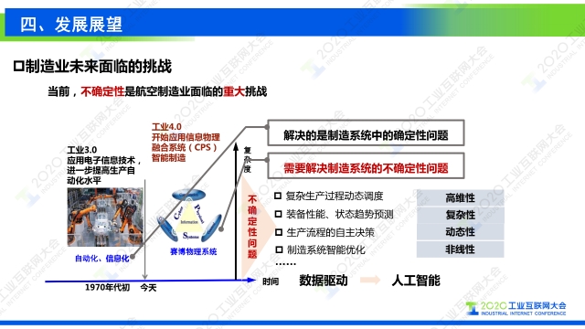 “不確定性是航空制造面臨的一個(gè)重大挑戰(zhàn)。工業(yè)3.0主要是實(shí)現(xiàn)自動(dòng)化,解決的是制造系統(tǒng)中的確定性問(wèn)題。工業(yè)4.0開(kāi)始建設(shè)CAPP物理系統(tǒng),也就是我們說(shuō)的CPS系統(tǒng),需要解決制造系統(tǒng)中的這么一個(gè)不確定性,例如復(fù)雜生產(chǎn)過(guò)程、動(dòng)態(tài)調(diào)度,裝配性能狀態(tài)的趨勢(shì)預(yù)測(cè),包括生產(chǎn)流程、工業(yè)流程的自主決策。整個(gè)智能制造系統(tǒng)智能化是非常重大的一個(gè)挑戰(zhàn)。為了解決未來(lái)航空制造中存在的不確定性問(wèn)題,需要高校的把人工智能、工業(yè)大數(shù)據(jù)至少進(jìn)行融合,高校低成本的獲取數(shù)據(jù),并利用數(shù)據(jù),通過(guò)數(shù)據(jù)利用不斷優(yōu)化制造過(guò)程,驅(qū)動(dòng)管理優(yōu)化與變革。”