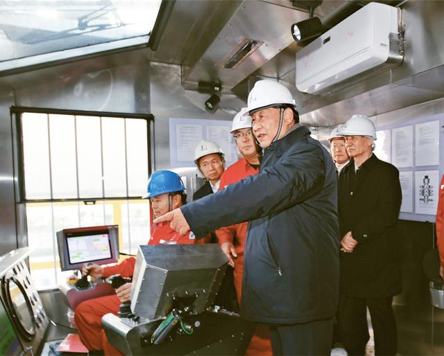 2021年10月22日下午,中共中央總書記、國家主席、中央軍委主席習近平在山東省濟南市主持召開深入推動黃河流域生態保護和高質量發展座談會并發表重要講話。這是座談會前,習近平21日下午在位于東營市萊州灣的勝利油田萊113區塊考察時,登上二層鉆井平臺,察看鉆井自動化設備?!⌒氯A社記者 李學仁/攝