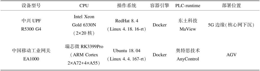 采用實時容器技術(shù)分別在5G UPF和工業(yè)網(wǎng)關(guān)上部署vPLC,將其改造成5G工業(yè)UPF和5G工控網(wǎng)關(guān),主要配置如表2所示。