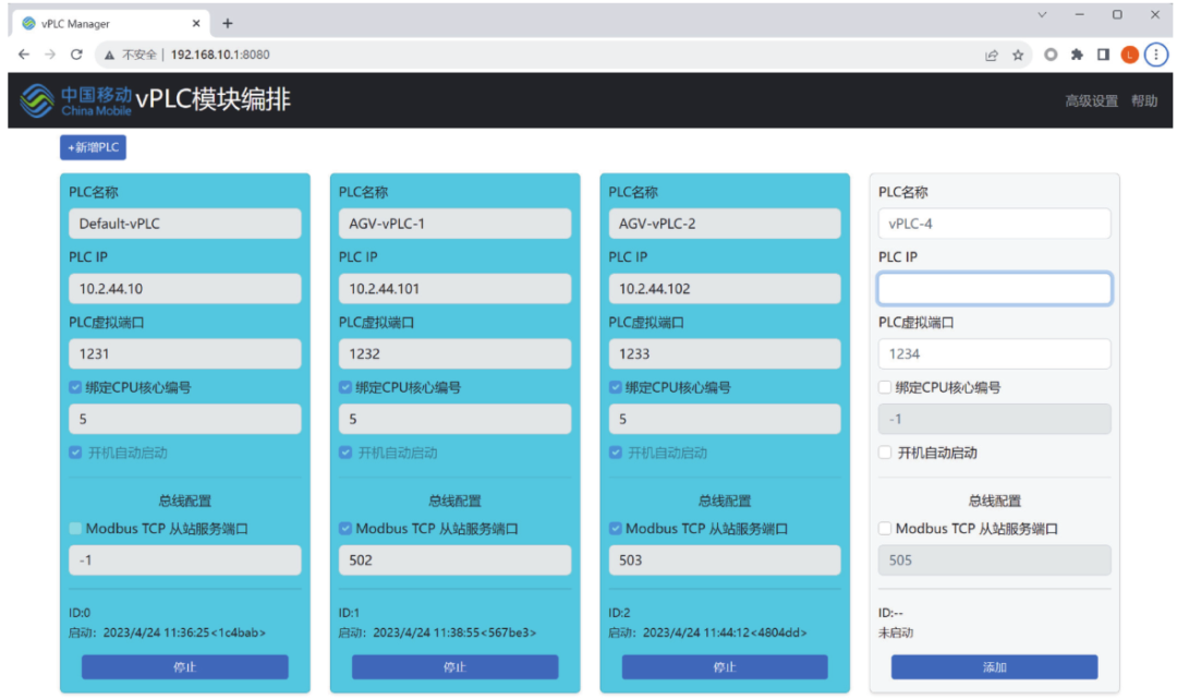 (3)vPLC編排為了支持UPF和網(wǎng)關(guān)統(tǒng)一編排,降低網(wǎng)關(guān)資源開銷,采用B/S架構(gòu)開發(fā)輕量級編排系統(tǒng)。用戶通過瀏覽器進行前端操作,后端分為管理模塊和編排模塊實現(xiàn)PLC容器編排部署。管理模塊部署在服務器上,主要提供Web訪問、容器鏡像下載、配置和監(jiān)測PLC容器等功能。編排模塊分別部署在UPF和網(wǎng)關(guān)上,主要提供容器鏡像拉取、容器環(huán)境配置、運行管理等功能。管理模塊和編排模塊通過HTTP相互通信。以容器運行監(jiān)測為例,編排模塊通過Docker Client定時與本機Docker服務通信,獲取容器運行狀態(tài)信息,然后上報給管理模塊,當管理模塊發(fā)現(xiàn)狀態(tài)異常時進行異常處理。vPLC編排系統(tǒng)界面如圖8所示。