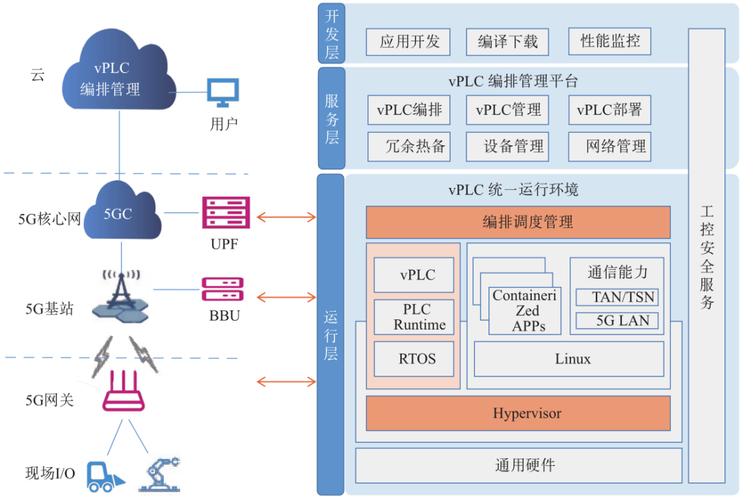 目前的5G云化PLC技術(shù)路線存在架構(gòu)不統(tǒng)一、不支持邊端協(xié)同、PLC應用無法編排等問題,尤其是5G網(wǎng)絡服務工業(yè)控制面臨時延、抖動、可靠性等挑戰(zhàn)。針對上述問題,本文提出5G虛擬化PLC技術(shù)架構(gòu),通過“端-邊-云”協(xié)同,實現(xiàn)3個“統(tǒng)一”:統(tǒng)一運行環(huán)境、統(tǒng)一部署調(diào)度和統(tǒng)一開發(fā)運維門戶。