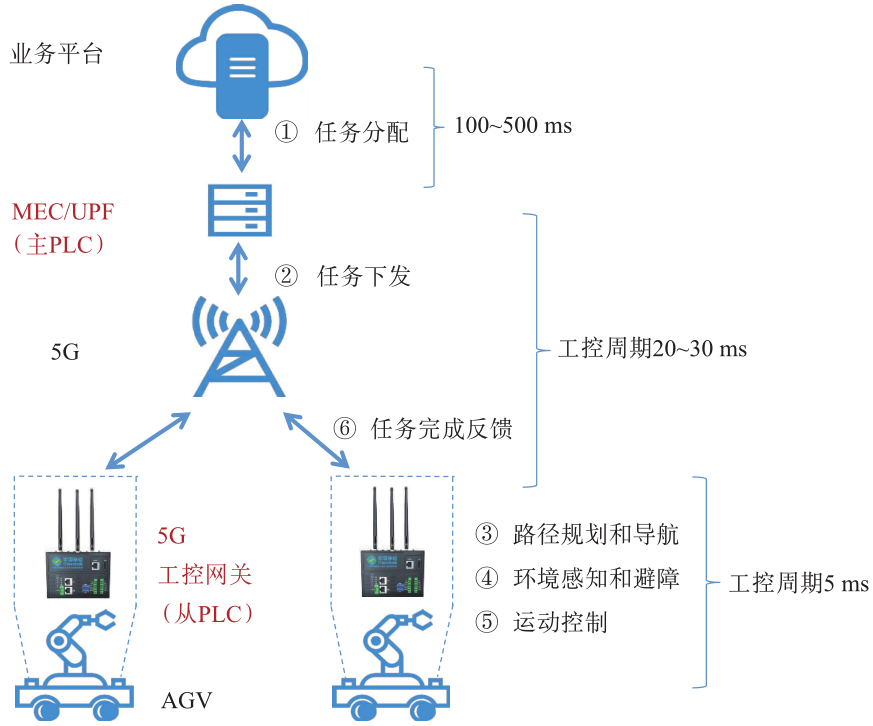 針對該場景需求,5G工控系統(tǒng)搭建了“主vPLC-從vPLC”端邊協(xié)同架構(gòu)(見圖4)。在邊緣側(cè),主vPLC部署在UPF上,實現(xiàn)PLC的集中化部署。主vPLC負責接收制造執(zhí)行系統(tǒng)(Manufacturing Execution System,MES)下發(fā)的任務指令,將任務封裝成控制指令,發(fā)送給AGV攜帶的從vPLC,同時接收從vPLC執(zhí)行過程中的反饋信息。在現(xiàn)場側(cè),從vPLC部署在5G工控網(wǎng)關(guān)上,實現(xiàn)對PLC和5G 數(shù)據(jù)傳輸設備(Data Terminal Unit,DTU)的“二合一”替換。一方面,從vPLC負責接收到主vPLC發(fā)送的控制指令,通過傳感器控制AGV的驅(qū)動系統(tǒng),實現(xiàn)精確的移動和定位。另一方面,當AGV到達目的地,從vPLC將任務執(zhí)行結(jié)果反饋給主vPLC,上報任務完成情況。