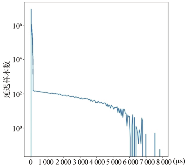 (1)Linux內(nèi)核改造首先,通過集成Preempt-RT補丁將UPF、網(wǎng)關(guān)原有內(nèi)核改造成實時內(nèi)核,改造后的內(nèi)核版本分別為Linux 4.18.16-rt和Linux 4.4.167-rt。在高負載情況下,改造前后進程處理最大時延可從8 ms降至500 μs。其次,配置CPU資源隔離將實時任務常駐特定CPU核心,降低任務切換開銷,將進程處理最大時延抖動進一步降到300 μs以下。再次,設計中斷路由,將外設中斷響應路由到其他CPU核心上處理,降低對實時任務運行的干擾。通過上述Linux內(nèi)核改造,進程處理最大時延抖動可降到100 μs以下(見圖6、圖7)。