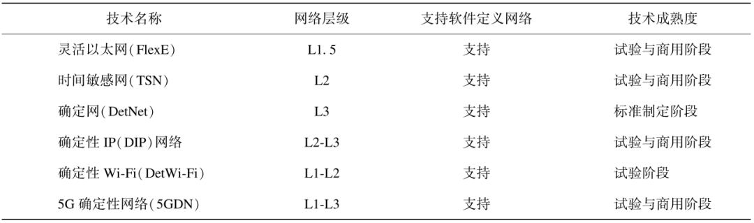 確定性網(wǎng)絡是一種能夠為用戶提供確定性服務質(zhì)量的網(wǎng)絡,具備靈活切換確定性服務和非確定性服務、自主控制提供確定性服務質(zhì)量等級的能力。典型的確定性網(wǎng)絡技術(shù)如表1所示。綜合來看,確定性網(wǎng)絡技術(shù)是實現(xiàn)5G工控系統(tǒng)網(wǎng)絡的主要路徑。5G確定性網(wǎng)絡(5G Deterministic Networking,5GDN)采用高精度時鐘同步、流量整形、資源預留等技術(shù)在5G網(wǎng)絡切片基礎(chǔ)上實現(xiàn)確定性帶寬、確定性時延和99.999 9%的連接可靠性,打造可預期、可規(guī)劃、可驗證,有確定性能力的無線網(wǎng)絡,提供“差異化+確定性”的業(yè)務體驗[5]。5G確定性網(wǎng)絡結(jié)合現(xiàn)場網(wǎng)絡、邊緣計算等技術(shù)可實現(xiàn)端到端確定性控制[6]。