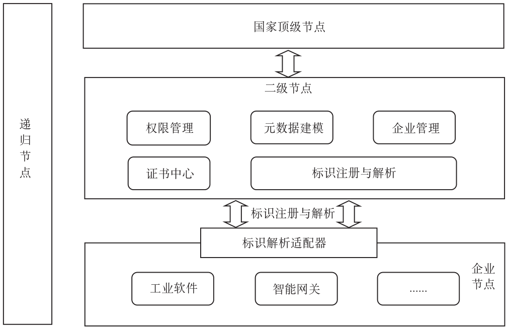 其中,國家頂級節點是指一個國家或地區內部最頂級的標識服務節點,可以在全國范圍內提供標識解析服務以及標識備案、標識認證等管理能力。二級節點是為特定行業或者通用平臺提供標識服務的公共節點,用于為工業企業提供分配標識編碼、證書及標識注冊、數據解析服務等。企業節點是企業內部的標識服務節點,可以提供標識注冊、解析等服務,既可以獨立部署,也可以作為企業信息系統內的一部分。遞歸節點是標識解析體系的關鍵性入口設施,使用緩存技術手段,快速響應客戶端的標識解析請求,提升整體解析服務性能。標識解析適配器常用于企業節點側對接企業業務系統,將業務數據進行數據加密處理后向二級節點發起標識注冊;并且負責對二級節點返回的標識解析結果進行解密處理,保證數據的可用性。