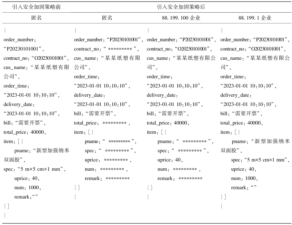 從安全性分析,通過實際案例對加密解密機制進行測試驗證,并根據采購訂單元數據模型(見表1)對應的標識解析結果(見表2)可知,引入安全加固策略前,任何身份均可匿名訪問所有信息;引入策略后,隱私數據被加密,只有相應的授權用戶才能解密訪問。從而驗證了本方案在隱私保護和數據訪問方面的安全有效性,確保了敏感信息的分權訪問。